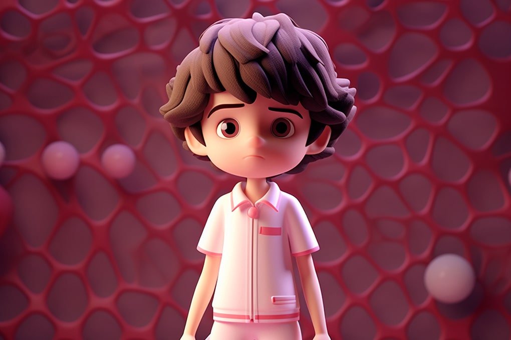 The 3D rendering would depict a cartoon-like boy playing tennis in a dynamic and playful style