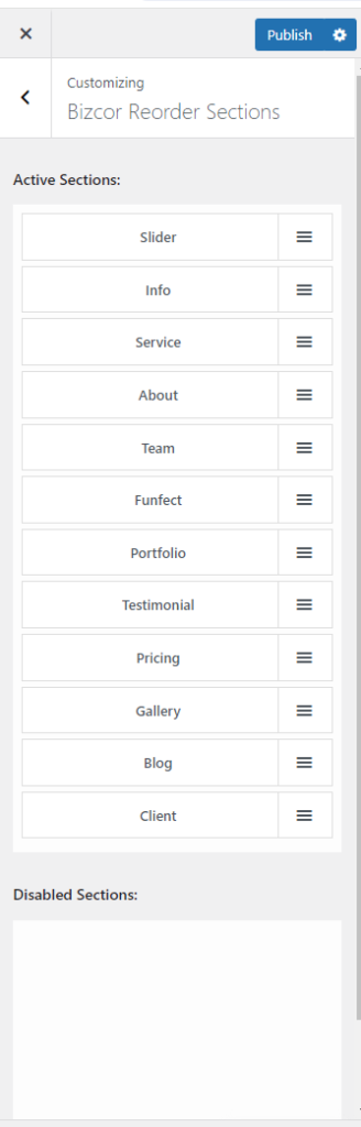 Go to Dashboard >> Appearance >> Customize >>Bizcor Reorder Sections