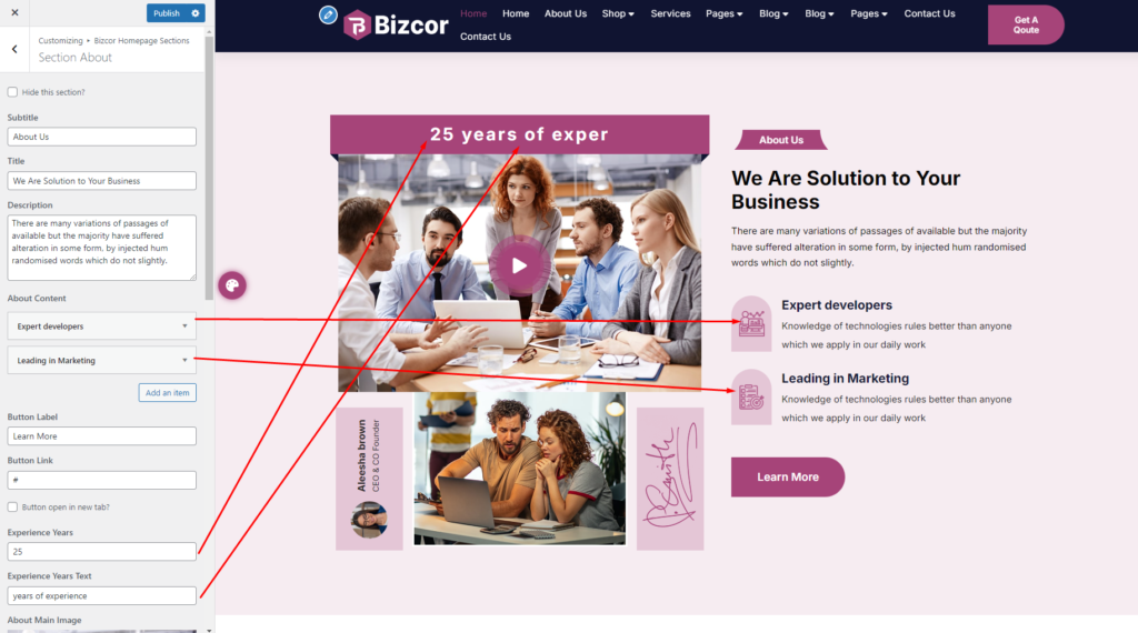 Navigate to Appearance > Customize > Bizcor Homepage Sections > Section About.