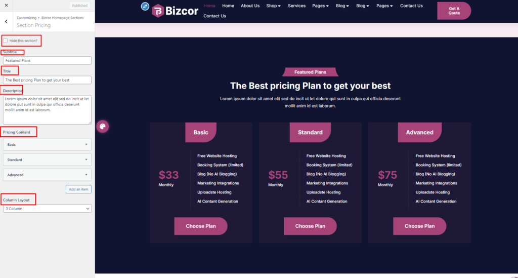 Adjust the Hide this section, Subtitle, Title, Description, Pricing Content, Column Layout.