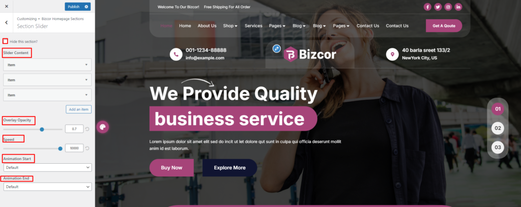 Navigate to Appearance > Customize > Bizcor Homepage Sections > Section Slider.