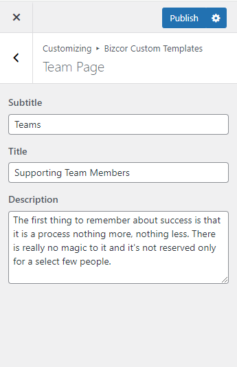 Navigate to Appearance > Customize > Bizcor Custom Templates > Team Page.