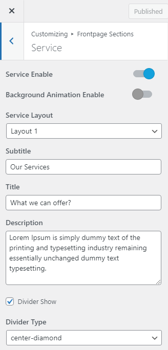 Hide/Show Service – Click this setting box to hide and show Service section on the home page.