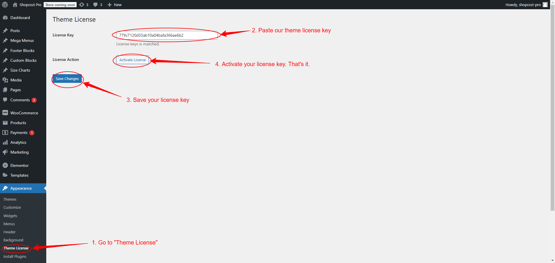 After that, you can see your theme purchased license key. Please copy your license Key. Then navigate to Your Site Admin Dashboard -> Appearance -> Theme License -> And paste your license key into this setting box.